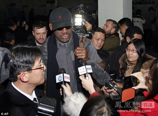 图为抵达平壤顺安机场的罗德曼被媒体包围。